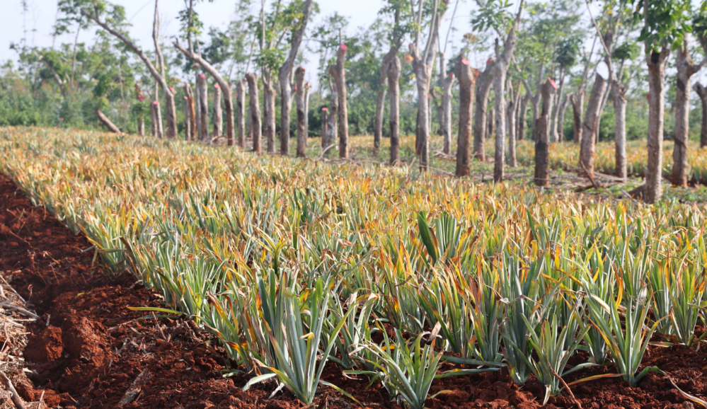 “發(fā)展林下經(jīng)濟(jì)好,大伙兒的收入‘蹭蹭見長’?!苯眨趶V東農(nóng)墾南華農(nóng)場有限公司第二十四作業(yè)組,工人們在膠林下種下一排排菠蘿苗?!胺N了近20畝?!痹撟鳂I(yè)組組長肖國金介紹道,橡膠園林下種菠蘿,有效利用了林下空間,實(shí)現(xiàn)了生態(tài)和經(jīng)濟(jì)效益雙提升。