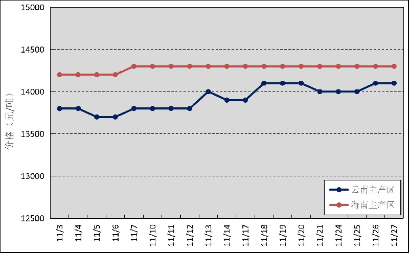 國內(nèi)主產(chǎn)區(qū):11月,云南產(chǎn)區(qū)生產(chǎn)較為穩(wěn)定,原料正常釋放,海南產(chǎn)區(qū)天氣狀況改善,原料價格波動不大。云南、海南鮮膠乳(折干膠)月均價格分別為13921元/噸、14279元/噸,環(huán)比分別上漲98元/噸、526元/噸。