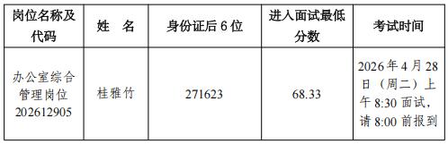 我單位2026年度公開招聘高校畢業(yè)生面試公告發(fā)布后,有1名考生因個人原因自愿放棄面試資格。經研究,決定在報考同一崗位的考生中,按照筆試成績由高到低的順序進行遞補。遞補考生名單如下:
