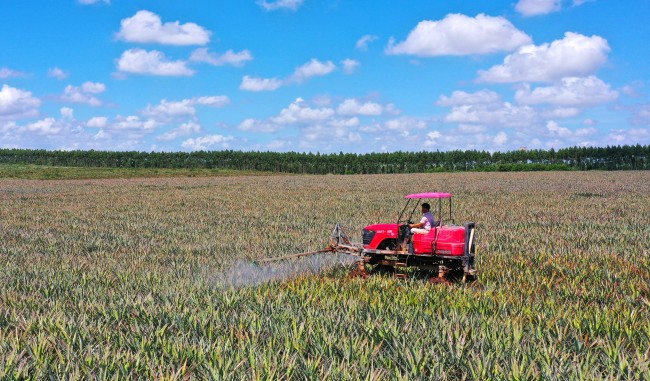 綠色種養(yǎng),守護(hù)產(chǎn)業(yè)可持續(xù)發(fā)展底色。綠色種植優(yōu)生態(tài),精準(zhǔn)管護(hù)提品質(zhì)。農(nóng)場(chǎng)以科技興農(nóng)為抓手,組建黨員技術(shù)攻關(guān)小組,聚焦菠蘿種植關(guān)鍵環(huán)節(jié)優(yōu)化服務(wù)模式,大力推進(jìn)機(jī)械化與數(shù)字化融合,引進(jìn)新型菠蘿種植機(jī)、北斗導(dǎo)航系統(tǒng)、植保無(wú)人機(jī)等設(shè)備,以科技賦能升級(jí)貼身經(jīng)營(yíng)質(zhì)效,推動(dòng)菠蘿種植向高效綠色方向轉(zhuǎn)型。黨員技術(shù)團(tuán)隊(duì)牽頭搭建水肥一體化灌溉系統(tǒng)、機(jī)械化施有機(jī)肥、套袋護(hù)果等田間管護(hù)服務(wù)鏈條,根據(jù)菠蘿生長(zhǎng)周期精準(zhǔn)調(diào)配水肥,實(shí)現(xiàn)每畝節(jié)水20%、節(jié)肥30%,為產(chǎn)業(yè)可持續(xù)發(fā)展筑牢綠色根基。
