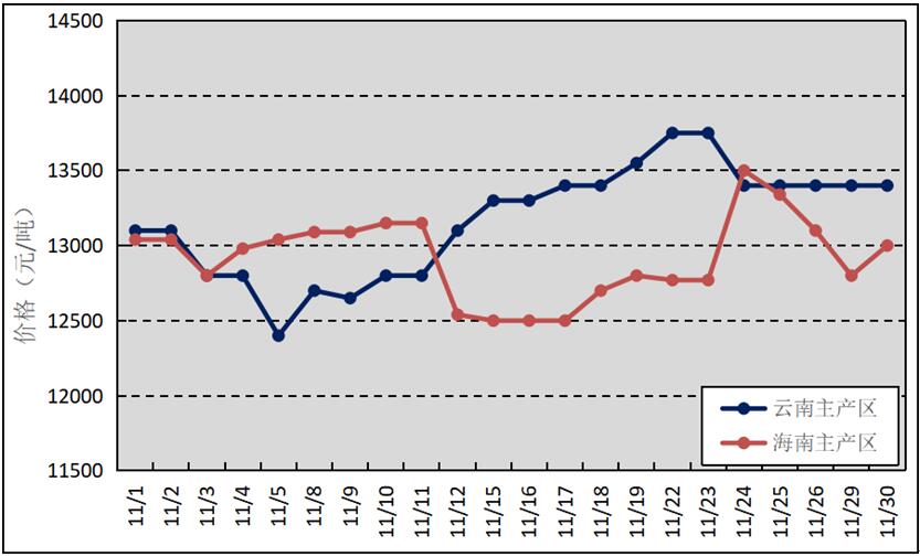 國(guó)內(nèi)主產(chǎn)區(qū):11月,我國(guó)天然橡膠主產(chǎn)區(qū)逐步向停割期過(guò)渡,受寒潮天氣影響,膠水產(chǎn)出有所減少,月底云南產(chǎn)區(qū)已大部分停割。海南原料膠(折干膠)月均價(jià)格為12918元/噸,環(huán)比下降295元/噸;云南原料膠(折干膠)月均價(jià)格為13168元/噸,環(huán)比上漲465元/噸。