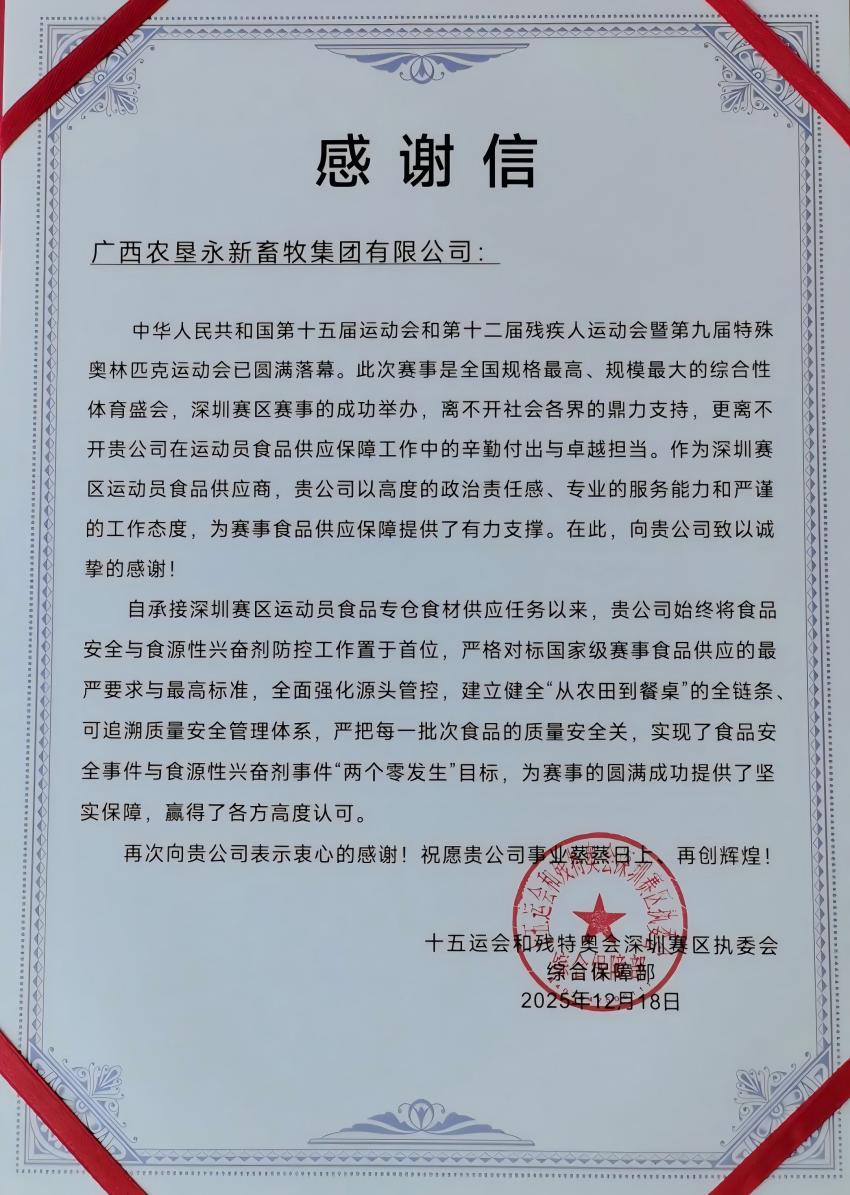 近日,永新畜牧集團收到第十五屆全國運動會和第十二屆殘疾人運動會暨第九屆特殊奧林匹克運動會深圳賽區(qū)執(zhí)委會發(fā)來的感謝信,對其在賽事期間的豬肉供應保障工作給予高度評價與誠摯感謝。一封感謝信,不僅是國家級賽事對永新畜牧集團的肯定,更是對其全產(chǎn)業(yè)鏈深耕的認可。