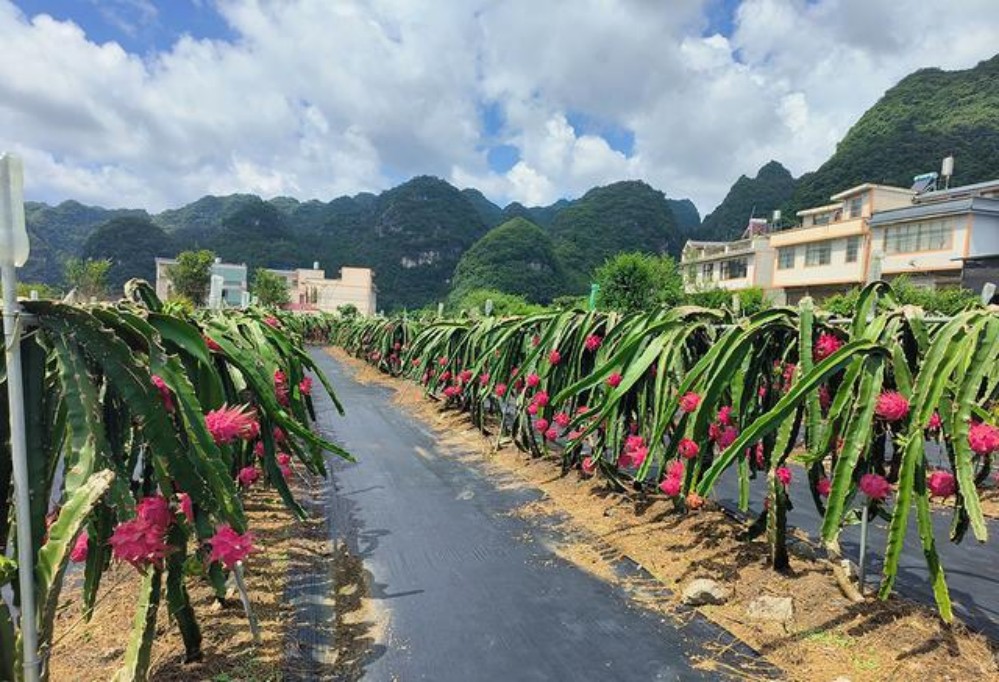 去年7月中旬,在興義市萬峰林雙升峰火龍果沃柑百畝采摘基地的火龍果迎來采收。一排排長莖上,一顆顆火紅的火龍果掛滿枝頭,果香四溢,吸引了不少游客前來體驗采摘樂趣。