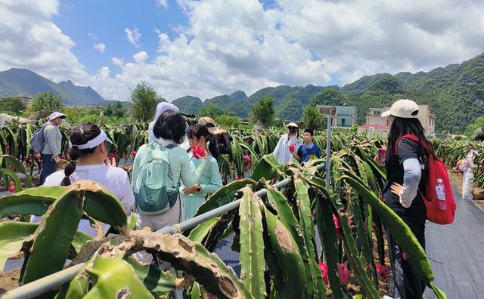基地負責人何長富介紹:“我們公司在萬峰林雙生村種植有火龍果、沃柑、果凍橙,總計100畝,其中火龍果占地65畝。因為這邊景區(qū)游客比較多,周末接納人次在300人左右,2024年總產(chǎn)量在20萬斤左右,總產(chǎn)值在120萬元?!?/span>