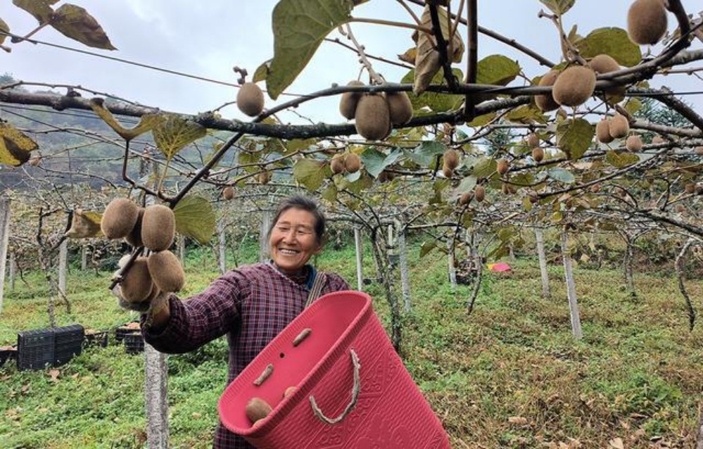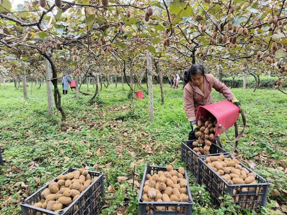 “果園的獼猴桃大豐收了,我們給老板摘獼猴桃,一天要摘1000多斤?!眲展と罕娞祈槕椪f。