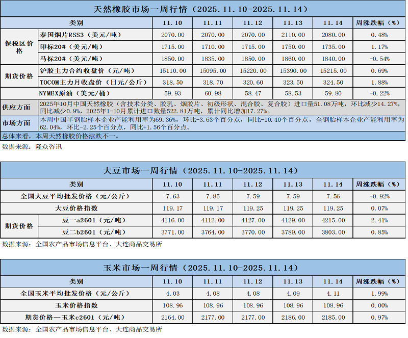 天然橡膠、大豆、玉米市場一周行情(2025.11.10-11.14)