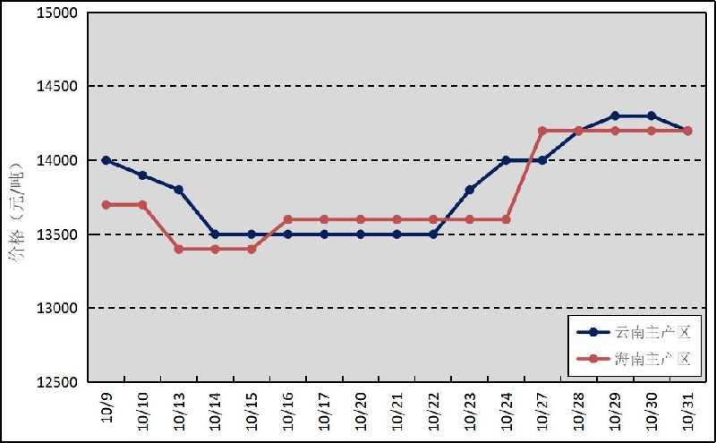 11月,云南、海南主產(chǎn)區(qū)將于下旬轉入減產(chǎn)期,國內(nèi)新膠上量或有所放緩;青島保稅區(qū)和一般貿(mào)易庫存將繼續(xù)呈季節(jié)性去庫狀態(tài),去庫幅度可能收窄,這些均對天然橡膠市場價格有所支撐。但東南亞主產(chǎn)區(qū)進入割膠旺季,原料供應上量預期增強;部分輪胎企業(yè)外貿(mào)訂單存下滑預期;合成橡膠價格下跌,對天然橡膠形成一定替代壓力,這些因素均對市場價格形成壓制。綜合預計,國產(chǎn)全乳膠銷區(qū)現(xiàn)貨市場價格將以震蕩運行為主,預計在14000—15000元/噸附近浮動。