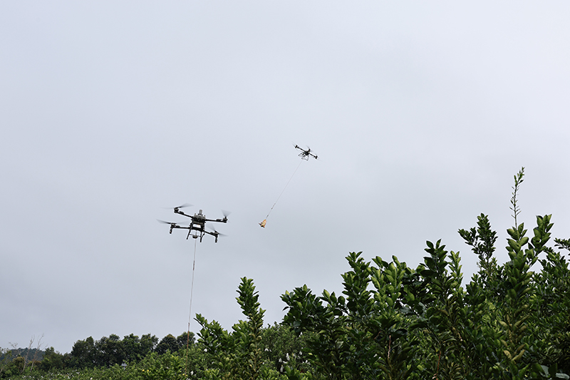 兩架無人機(jī)同時(shí)吊運(yùn)。勐海縣融媒體中心供圖