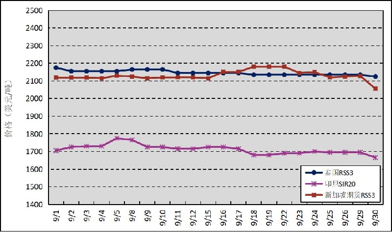 國外主產(chǎn)區(qū):9月,泰國RSS3平均價格為2146美元/噸,環(huán)比下跌40美元/噸,最高價為2175美元/噸,最低價為2125美元/噸;印尼SIR20平均價格為1712美元/噸,環(huán)比上漲30美元/噸,最高價為1775美元/噸,最低價為1665美元/噸;新加坡RSS3期貨主力合約月均結(jié)算價格為2131美元/噸,環(huán)比下跌36美元/噸,最高價為2181美元/噸,最低價為2056美元/噸。