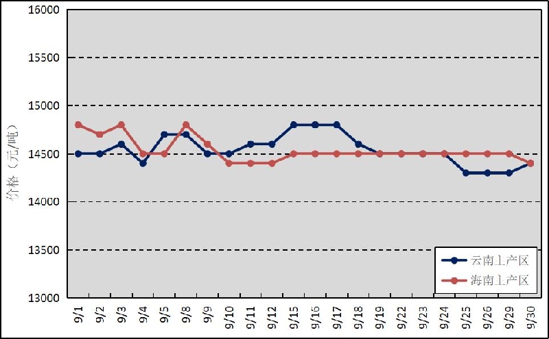 據(jù)農(nóng)業(yè)農(nóng)村部農(nóng)墾局監(jiān)測,9月,泰國3號煙膠片(RSS3)和印尼20號標(biāo)準(zhǔn)膠(SIR20)市場價格月內(nèi)呈穩(wěn)中微降走勢,月均價格環(huán)比分別微跌和微漲。國內(nèi)主銷區(qū)國產(chǎn)全乳標(biāo)準(zhǔn)膠(SCRWF)現(xiàn)貨價格走勢與國外基本一致,全月整體在14250—15400元/噸之間波動,價格重心較上月上移。