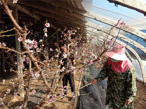 與此同時,在位于江南茶區(qū)郎溪縣的農(nóng)墾十字鋪茶場3萬畝茶園里,茶農(nóng)們正在對茶樹進(jìn)行修邊、打頭、施肥,著手做好采茶準(zhǔn)備。而在黃河故道旁邊的碭山果園場果樹大棚里,桃花、杏花競相開放,職工正抓緊授粉。種植戶周華萍說,“往年授粉都要雇不少人,今年由于疫情,防止扎堆,沒有雇人,搶抓時間,爭取授上粉,座上果,不減收?!蹦壳肮麍@場800畝大棚果樹大部分已經(jīng)完成授粉工作。