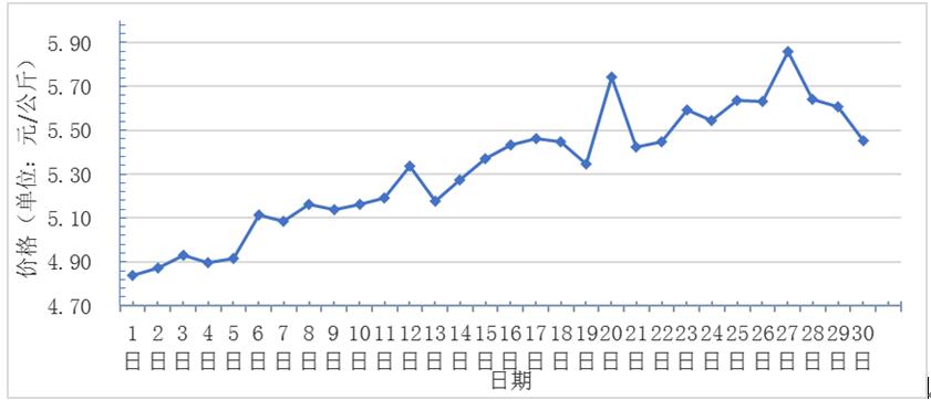 11月,全國重點監(jiān)測農(nóng)產(chǎn)品批發(fā)市場香蕉總交易量達9萬噸,同比上漲8.4%,環(huán)比下降2.2%;總交易價值 48607.5萬元,同比上漲35.1%,環(huán)比上漲14.1%。日平均價格最高為5.9元/千克,最低為4.8元/千克,全月平均價格為5.3元/千克,同比上漲12.8%,環(huán)比上漲6%(每日價格變化如圖)。