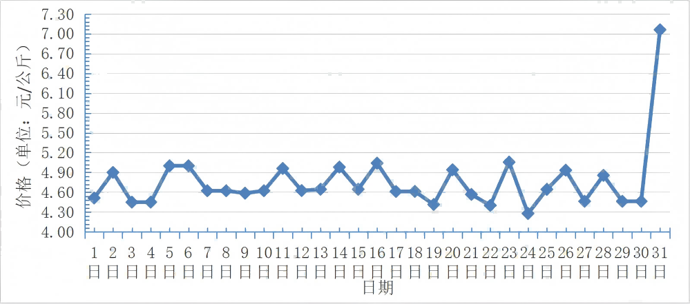 10月,全國重點(diǎn)監(jiān)測農(nóng)產(chǎn)品批發(fā)市場香蕉總交易量達(dá)2.3萬噸,同比基本持平,環(huán)比上漲4.5%;總交易價值12401.1萬元,同比下降19.2%,環(huán)比下降0.9%。日平均價格最高為7.0元/千克,最低為4.3元/千克,全月平均價格為 4.8元/千克,同比下降30.4%,環(huán)比下降4.0%(每日價格變化如圖)。