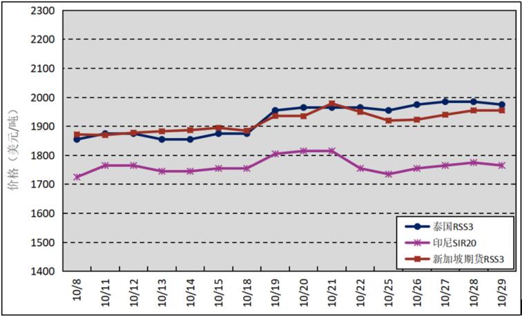 國外主產區(qū):10月,泰國RSS3平均價格為1924美元/噸,環(huán)比上漲95美元/噸,最高價為1985美元/噸,最低價為1855美元/噸;印尼SIR20平均價格為1765美元/噸,環(huán)比上漲107美元/噸,最高價為1815美元/噸,最低價為1725美元/噸;新加坡RSS3期貨主力合約月均結算價格為1916美元/噸,環(huán)比上漲128美元/噸,最高價為1979美元/噸,最低價為1870美元/噸。