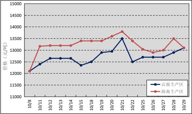 國內主產區(qū):10月,我國天然橡膠主產區(qū)仍處于割膠旺季,但降雨較多、海南主產區(qū)遭受臺風襲擊,割膠生產和橡膠產量受到一定影響。海南原料膠(折干膠)月均價格為13213元/噸,環(huán)比上漲1113元/噸;云南原料膠(折干膠)月均價格為12703元/噸,環(huán)比上漲932元/噸。