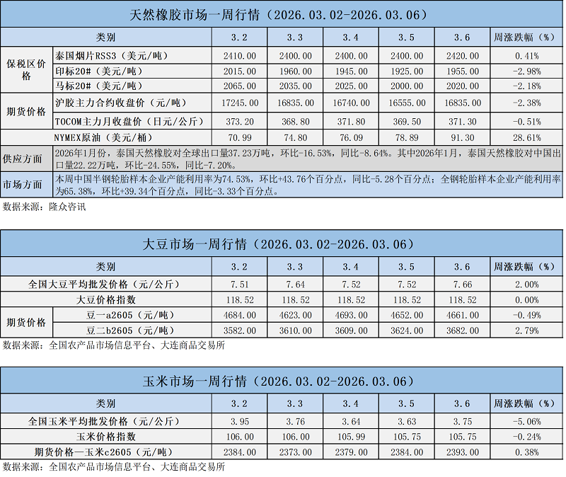 天然橡膠、大豆、玉米市場一周行情(2026.03.02-03.06)