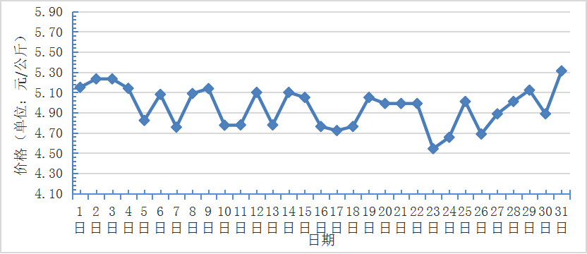 8月,全國(guó)重點(diǎn)監(jiān)測(cè)農(nóng)產(chǎn)品批發(fā)市場(chǎng)香蕉總交易量達(dá)2.3萬噸,同比下降32.3%,環(huán)比上漲4.5%;總交易價(jià)值11806.3萬元,同比下降43.5%,環(huán)比下降1.1%。日平均價(jià)格最高為5.3元/千克,最低為4.7元/千克,全月平均價(jià)格為 5.0元/千克,同比下降21.9%,環(huán)比下降9%(每日價(jià)格變化如圖)。