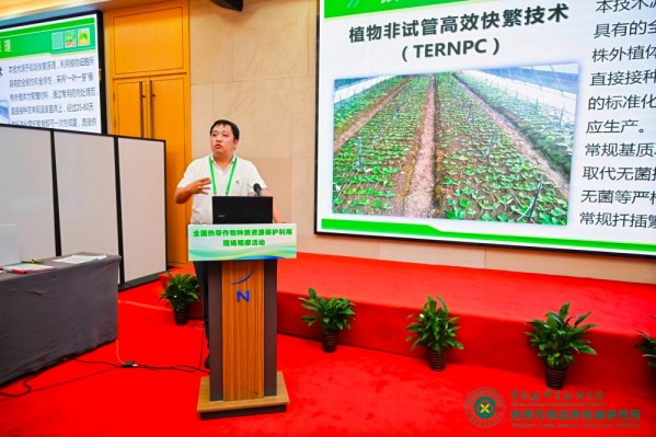 北京開源創(chuàng)眾農(nóng)業(yè)科技有限公司總經(jīng)理李一澤介紹了植物非試管快繁技術(shù)的特點和工作流程,并闡述了其在熱作種質(zhì)資源保護與利用中的作用。