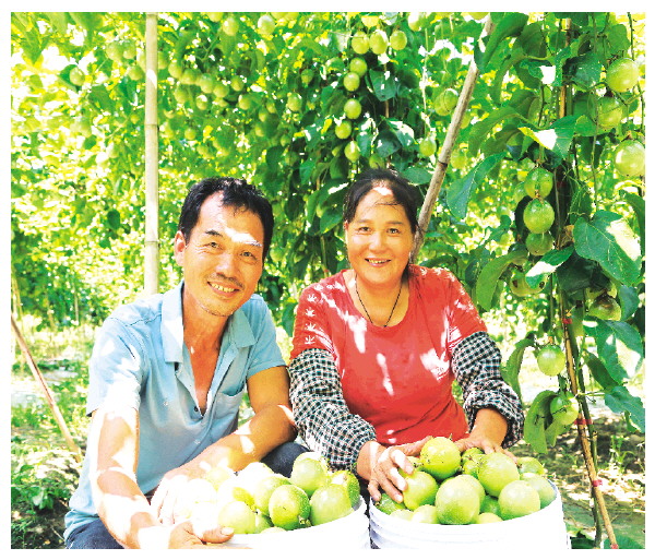 靈川縣的百香果種植戶喜迎豐收,笑容滿面。王道梅 攝